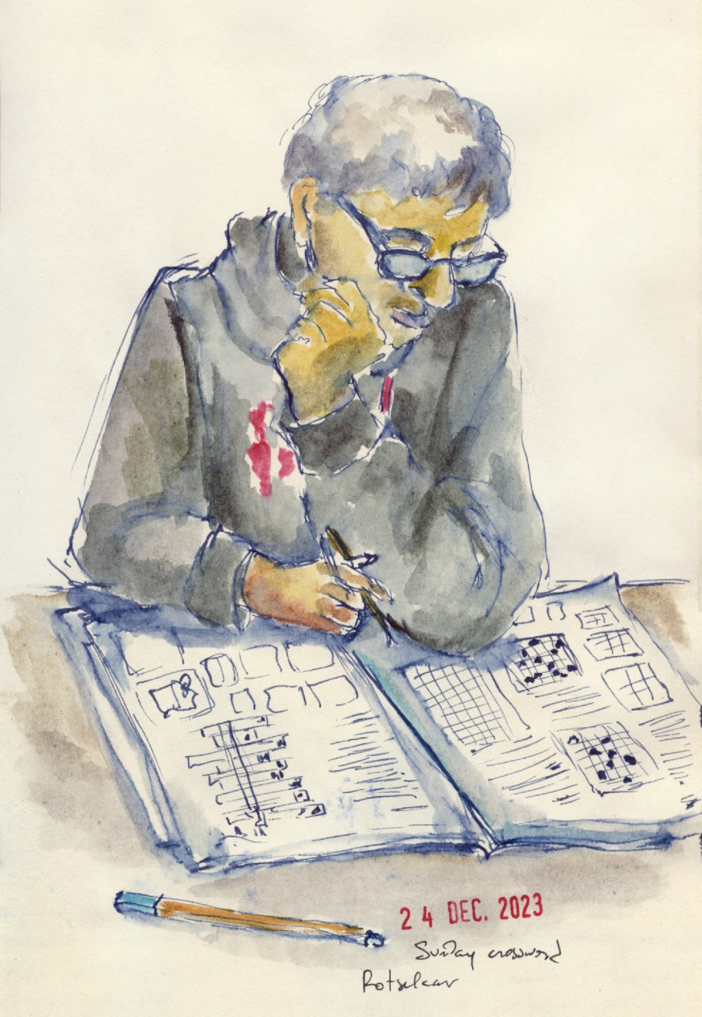 The iPad drawings were starting to get too aesthetically objective, so I’m taking it back to basics. Like here, my partner and his crossword puzzle on Sunday morning in humble ink and watercolor.