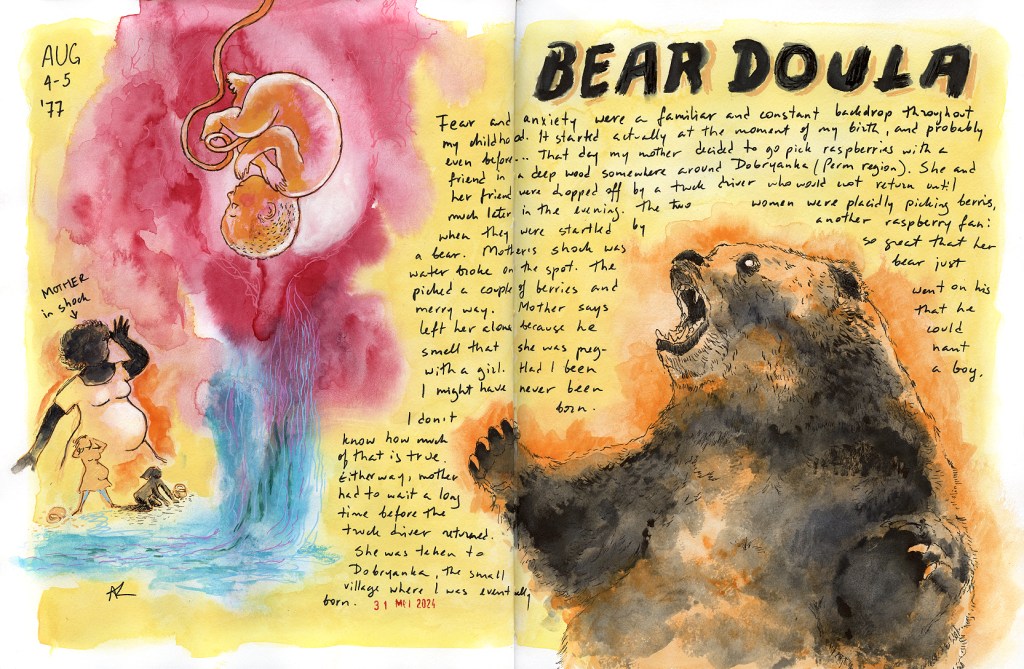 Sometimes I revisit the past in my journals. This is, for example, a spread about my birth, which was induced by an unexpected appearance of a bear.