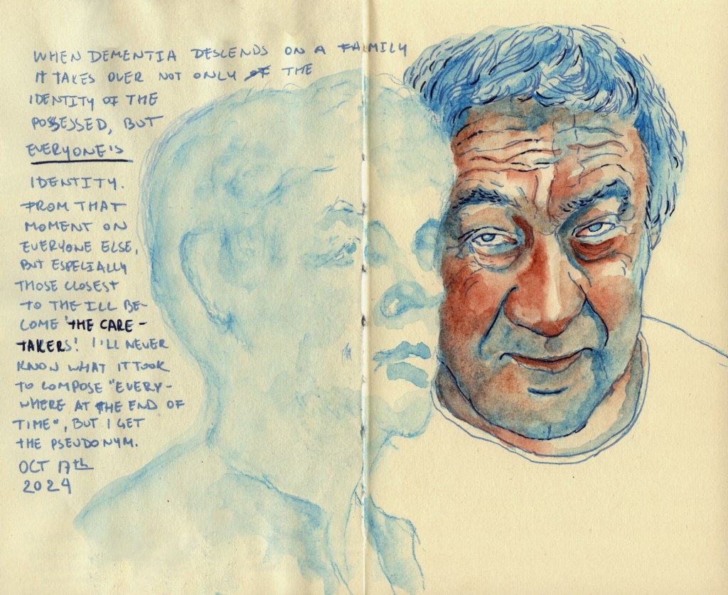 When Dementia enters the stage, everyone else becomes a supporting character. Mainly the Caretaker. (Sketch based on Dementia brochure photos.)